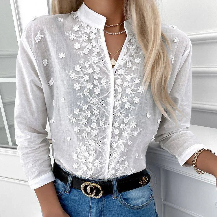 Women's autumn and winter women's new cotton and linen V-neck embroidered hollow top long-sleeved shirt
